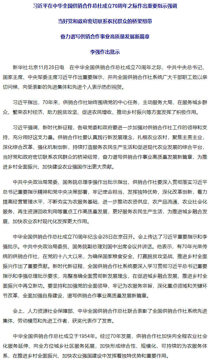 習(xí)近平在中華全國(guó)供銷合作總社成立70周年之際作出重要指示