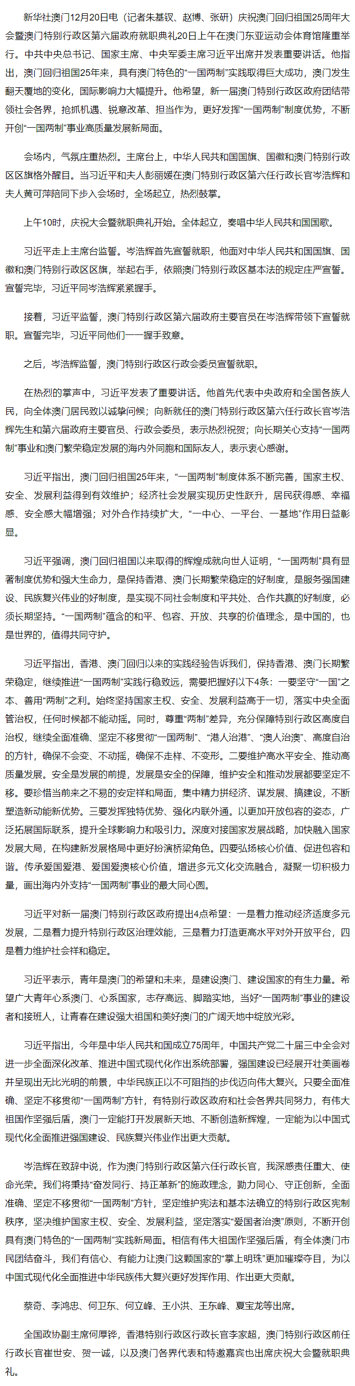 慶祝澳門回歸祖國25周年大會(huì)暨澳門特別行政區(qū)第六屆政府就職典禮隆重舉行 習(xí)近平出席并發(fā)表重要講話