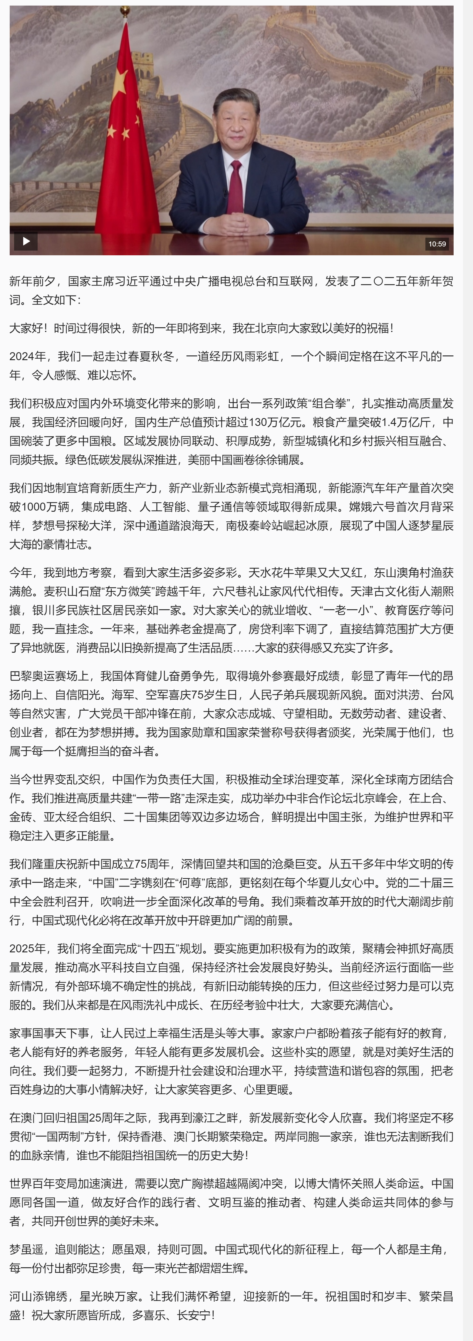 完整版視頻丨國家主席習(xí)近平發(fā)表二〇二五年新年賀詞