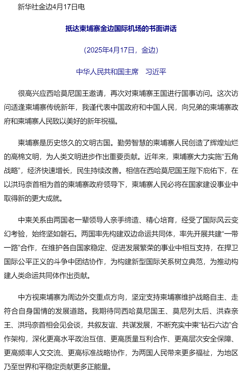 習(xí)近平抵達(dá)柬埔寨金邊國際機場發(fā)表書面講話