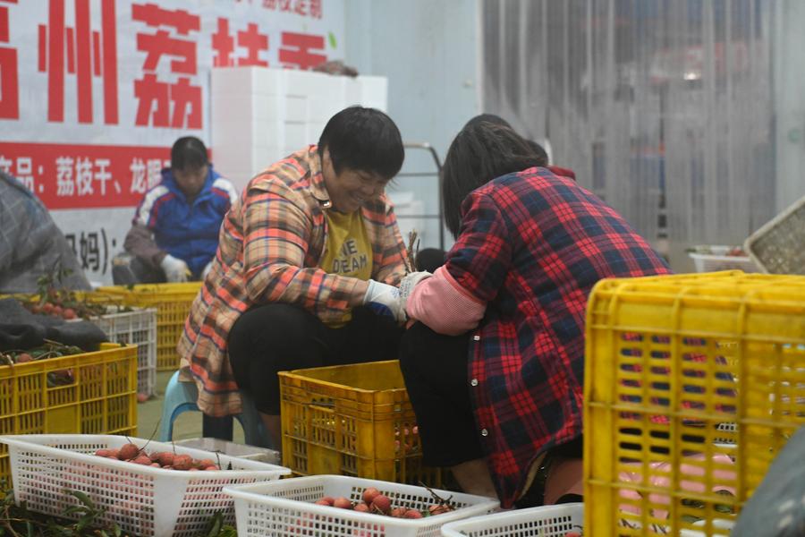 6月18日,果農(nóng)在廣東茂名高州的一個(gè)冷庫(kù)中打包荔枝。新華社記者 肖恩楠 攝