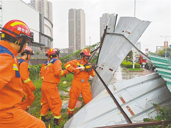 7月20日,在了解到勝利南路東匯城商場(chǎng)前圍擋被大風(fēng)吹倒的情況后,消防隊(duì)員到現(xiàn)場(chǎng)開(kāi)展切割工作,并與物業(yè)交接后續(xù)處置工作。陳嬋 攝