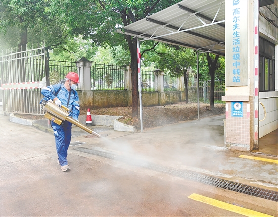 ??? 江門(mén)日?qǐng)?bào)訊 (文/圖 記者/蔡昭璐 通訊員/江城管) 8月2日下午2時(shí)許,在蓬江區(qū)新昌路高爾夫生活垃圾中轉(zhuǎn)站,環(huán)衛(wèi)工人手持金屬?lài)婌F槍?zhuān)瑢?duì)垃圾中轉(zhuǎn)站內(nèi)部、周邊綠化帶、排水渠等重點(diǎn)區(qū)域展開(kāi)消殺作業(yè),以有效降低蚊蟲(chóng)密度,防控基孔肯雅熱、登革熱等蚊媒傳染病。