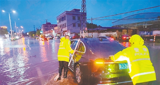昨天傍晚,鶴山交警在雨中幫助群眾轉(zhuǎn)移車輛。 鶴山市公安局供圖