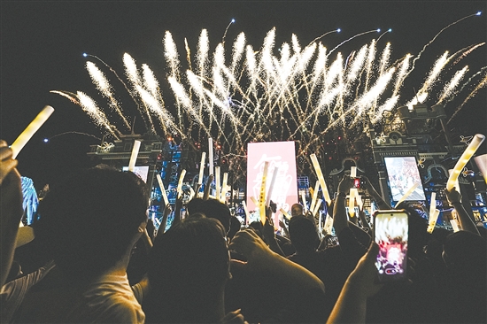 ??? 江門日?qǐng)?bào)訊 (記者/李銀換) 8月15日夜晚,赤坎華僑古鎮(zhèn)上空煙花絢爛,香港組合農(nóng)夫登臺(tái)獻(xiàn)唱,熟悉的旋律瞬間點(diǎn)燃現(xiàn)場(chǎng)氛圍,游客揮舞熒光棒齊聲合唱,度過(guò)了一個(gè)難忘的夜晚。