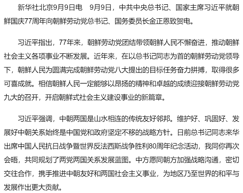 習近平就朝鮮國慶77周年向朝鮮最高領導人金正恩致賀電