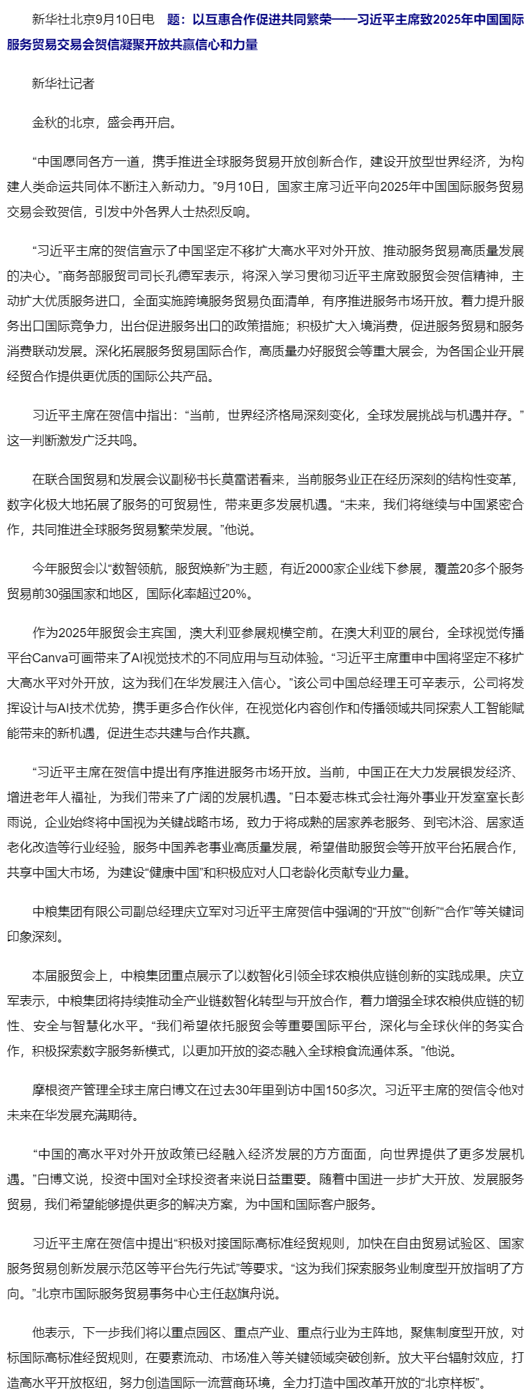 以互惠合作促進(jìn)共同繁榮——習(xí)近平主席致2025年中國國際服務(wù)貿(mào)易交易會(huì)賀信凝聚開放共贏信心和力量