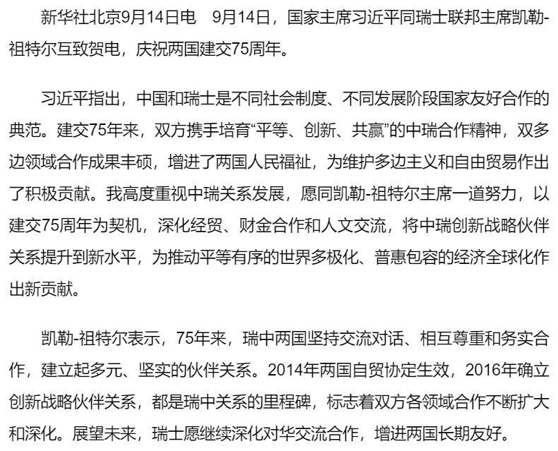 習近平同瑞士聯邦主席凱勒-祖特爾就中瑞建交75周年互致賀電