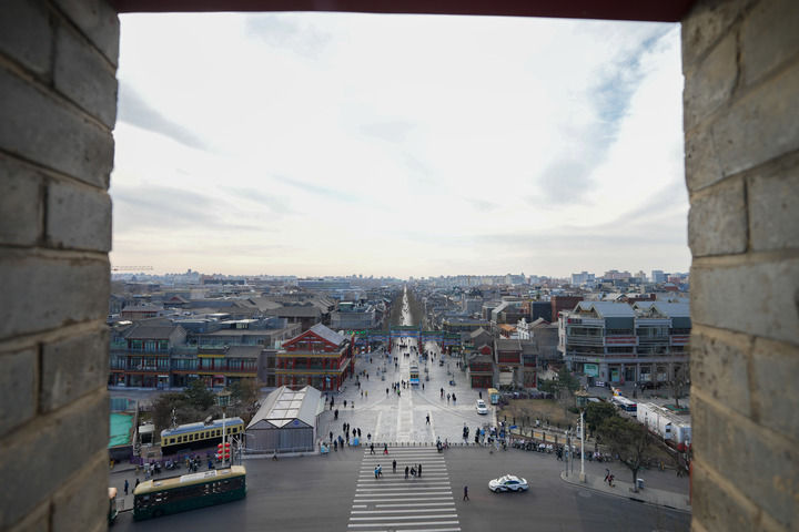 ??2024年12月26日,從正陽門箭樓內(nèi)向南拍攝的北京前門大街和遠處的永定門城樓。新華社記者 鞠煥宗 攝