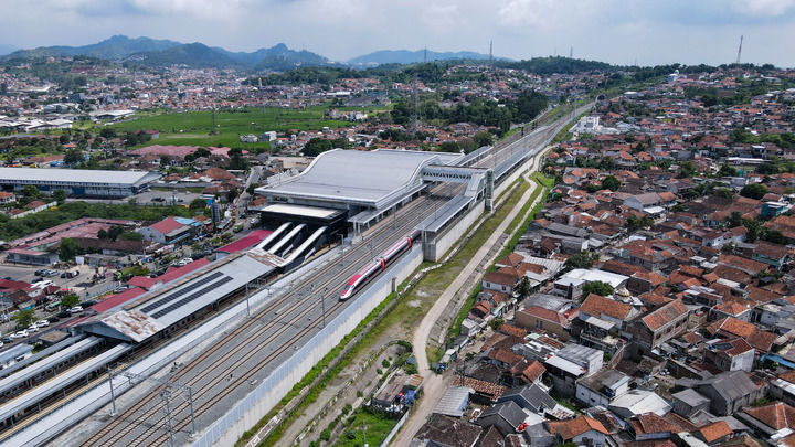 ??這是2025年5月20日在印度尼西亞帕達拉朗拍攝的雅萬高鐵列車(無人機照片)。新華社記者 徐欽 攝