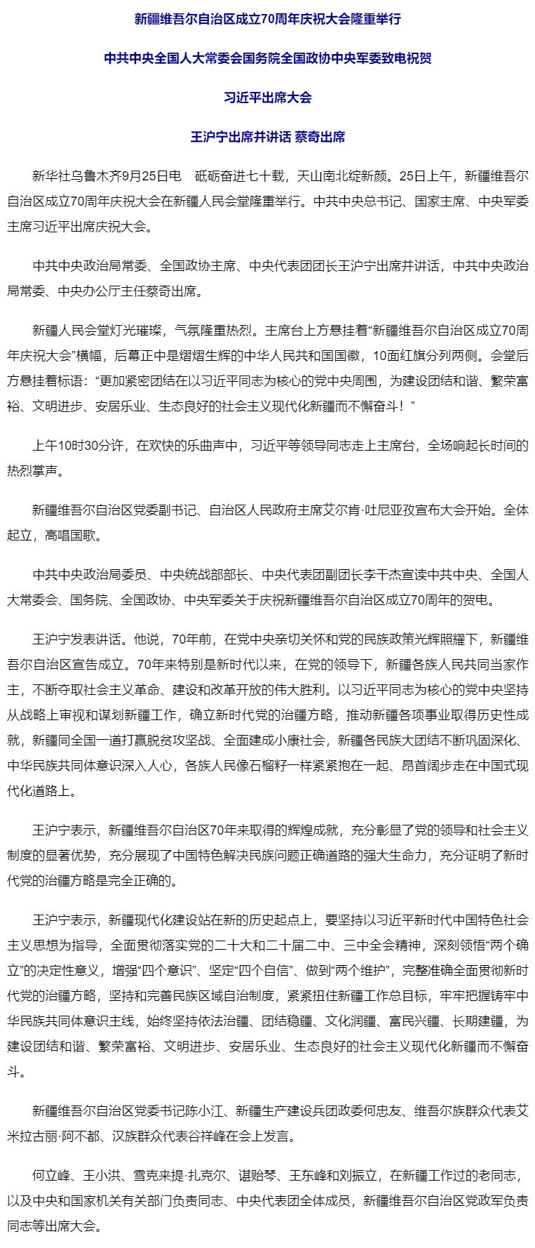 新疆維吾爾自治區(qū)成立70周年慶祝大會隆重舉行 習近平出席大會