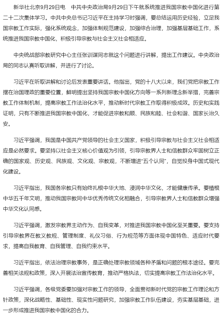 習(xí)近平在中共中央政治局第二十二次集體學(xué)習(xí)時強(qiáng)調(diào) 系統(tǒng)推進(jìn)我國宗教中國化 積極引導(dǎo)宗教與社會主義社會相適應(yīng)