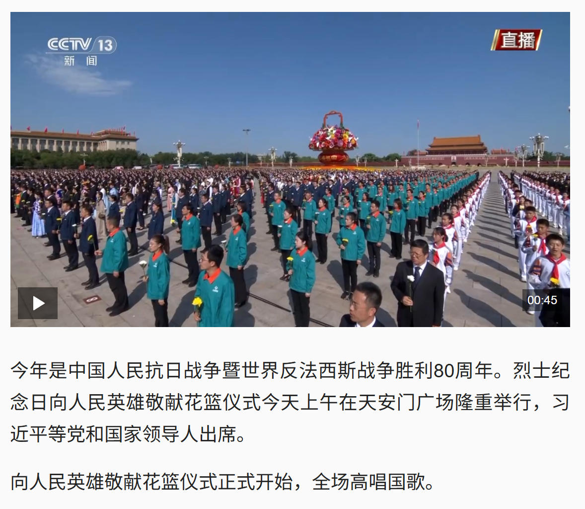 獨家視頻丨向人民英雄敬獻花籃儀式正式開始 全場高唱國歌