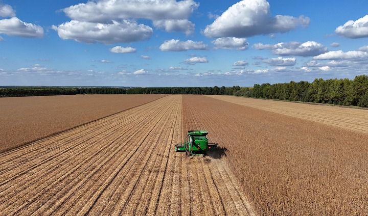 ??2025年9月19日,在北大荒集團(tuán)黑龍江格球山農(nóng)場(chǎng)有限公司大豆地塊,收獲機(jī)車在進(jìn)行收獲作業(yè)(無人機(jī)照片)。新華社發(fā)(陸文祥攝)