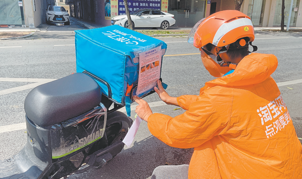 ????鶴山動(dòng)員快遞員、外賣騎手、網(wǎng)約車司機(jī)等新就業(yè)群體參與疫情防控,組建了由順豐、EMS、美團(tuán)、餓了么等企業(yè)騎手和快遞員組成的網(wǎng)約配送行業(yè)志愿服務(wù)隊(duì)。騎手利用等待出餐的3至5分鐘,提醒商戶清理后廚排水溝等風(fēng)險(xiǎn)區(qū)域,動(dòng)員沿街商戶加入聯(lián)防聯(lián)控網(wǎng)絡(luò)。