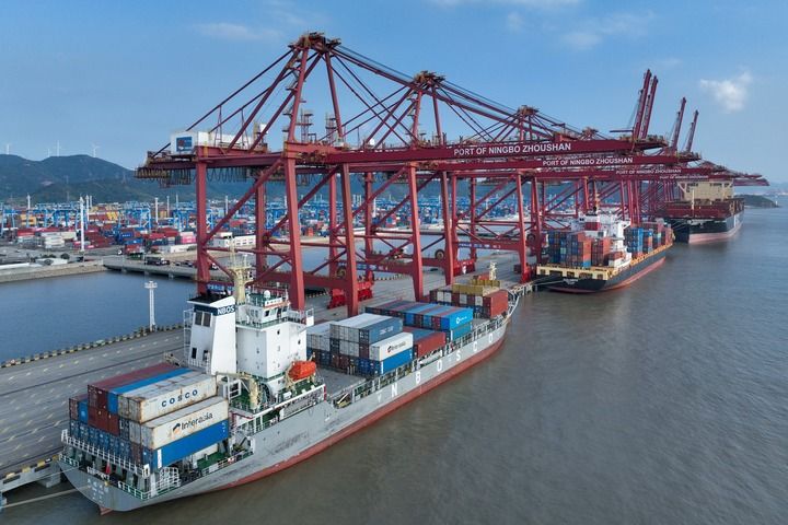 ??2025年10月13日,在寧波舟山港金塘港區(qū)大浦口集裝箱碼頭,船舶進行集裝箱裝卸作業(yè)(無人機照片)。新華社發(fā)(鄒訓永攝)