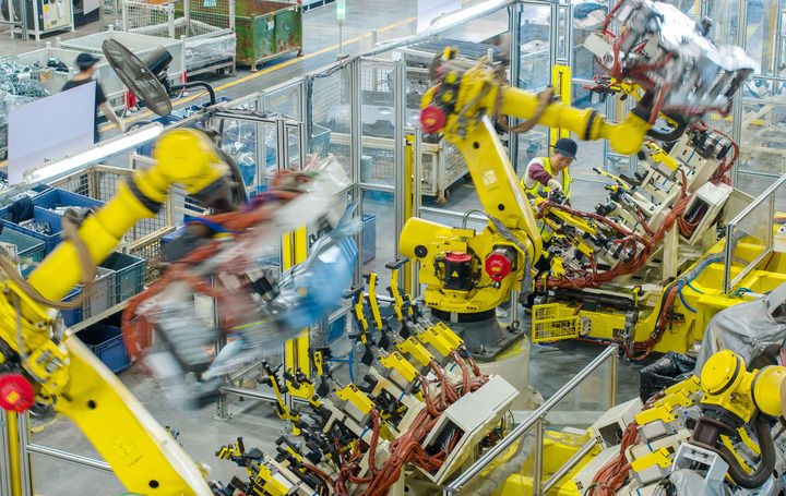 ??2025年10月9日,浙江省湖州市長興經(jīng)濟技術(shù)開發(fā)區(qū)的長興地通汽車部件有限公司技術(shù)人員操控工業(yè)機器人生產(chǎn)新能源汽車配件(無人機照片)。新華社發(fā)(譚云俸攝)