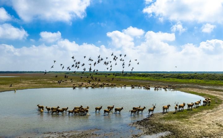 ??2025年10月11日,在江蘇東臺條子泥濕地,候鳥飛翔,成群野生麋鹿悠閑散步,一派人與自然和諧共生的生態(tài)美景(無人機照片)。新華社發(fā)(孫家錄攝)