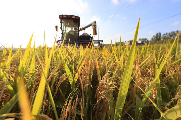 ??2025年10月16日,在江蘇省連云港市贛榆區(qū)城頭鎮(zhèn)中青墩村,種植戶駕駛收割機搶收水稻。新華社發(fā)(司偉攝)