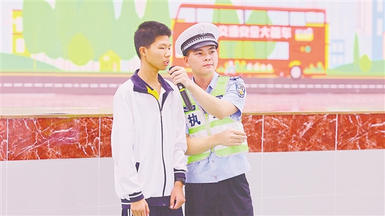 在互動體驗(yàn)環(huán)節(jié),停放在廣場上的紅色交通安全大篷車,吸引了現(xiàn)場參與者競相排隊(duì)登車體驗(yàn),在模擬駕駛、打卡游戲等互動功能區(qū)中,實(shí)現(xiàn)了交通安全意識與自護(hù)能力同步提升。