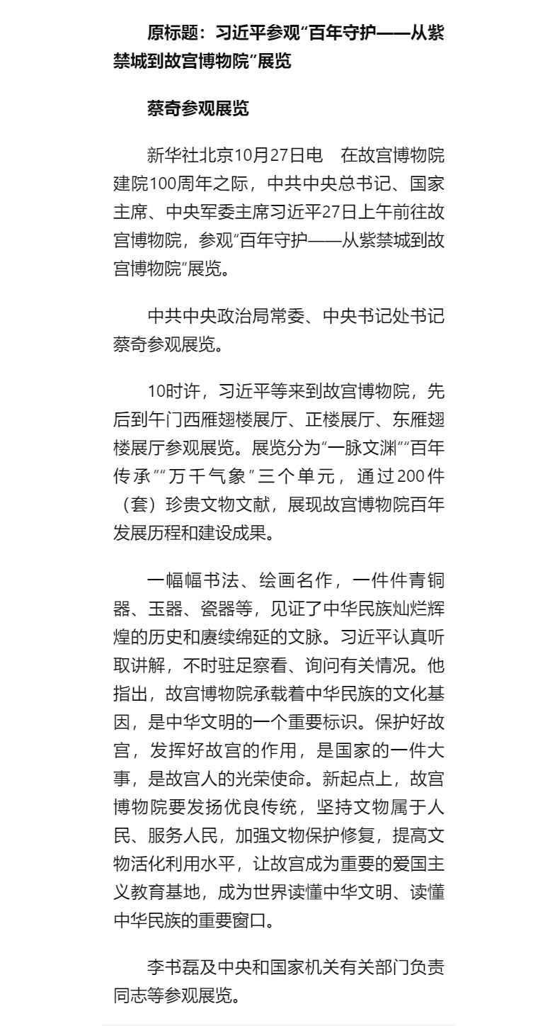 習(xí)近平參觀“百年守護——從紫禁城到故宮博物院”展覽