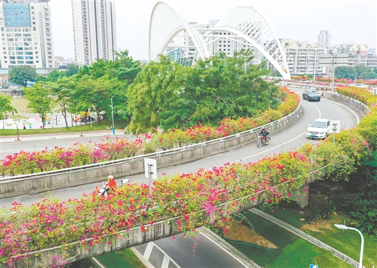 在市區(qū)東華大橋,姹紫嫣紅的簕杜鵑宛如一個個花仙子唯美綻放,歡迎全國各地的運動員和游客來江門參賽、觀賽、旅游。