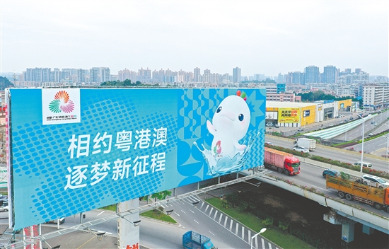 在江門大道與迎賓大道交叉處的大型T牌上,“相約粵港澳 逐夢新征程”的字眼十分醒目。