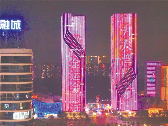 在江門萬達廣場,“雙子星”為十五運會亮燈。