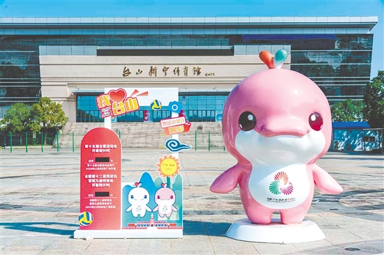 在臺山新寧體育館前面,擺放著十五運會開幕式倒計時牌和吉祥物。