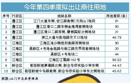 ????下半年市區(qū)共有10宗商住用地“待嫁”,計劃供應用地面積約40萬平方米(599.36畝)。從區(qū)域來看,蓬江區(qū)共有4宗商住用地供應,合計用地面積約16.6萬平方米(248.79畝),2宗位于北新區(qū),1宗位于濱江新區(qū),1宗位于雙龍片區(qū);江海區(qū)也計劃供應4宗商住用地,兩宗位于高新區(qū),另外兩宗則分別位于禮樂和江南街道,計劃供應用地面積約17.4萬平方米(260.53畝);新會區(qū)計劃供應2宗商住用地,均位于樞紐新城,計劃供應用地面積約6萬平方米(90.04畝)。